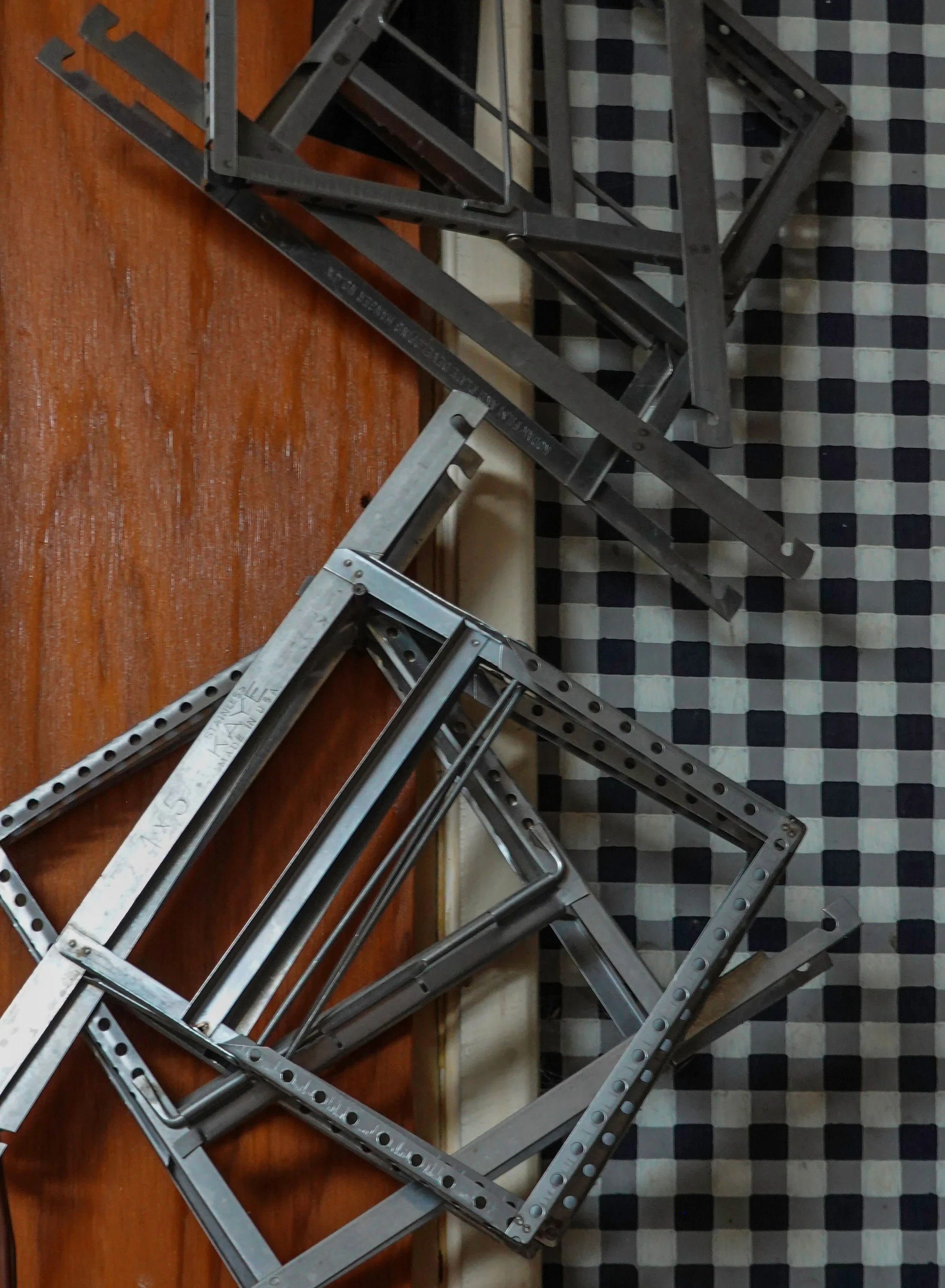Sit with Nancy’s ‘creatures’ as she referred to them, placed in the front yard and throughout the house. Notice the golden star with a burgundy dress climbing a wooden ladder made of thin branches. Enjoy the late afternoon sun as it illuminates Nancy’s mural, painted on the peach colored walls that lead up to the second floor. With a broad range of pastel colors, Nancy’s creation depicts a row of houses, neatly stacked, one next to the other, in angular, geometrical squares and rectangles. Observe the humming energy of Eric’s darkroom, overflowing with boxes of negatives, scrawled notes and prints tacked to the black-and-white checkered walls.